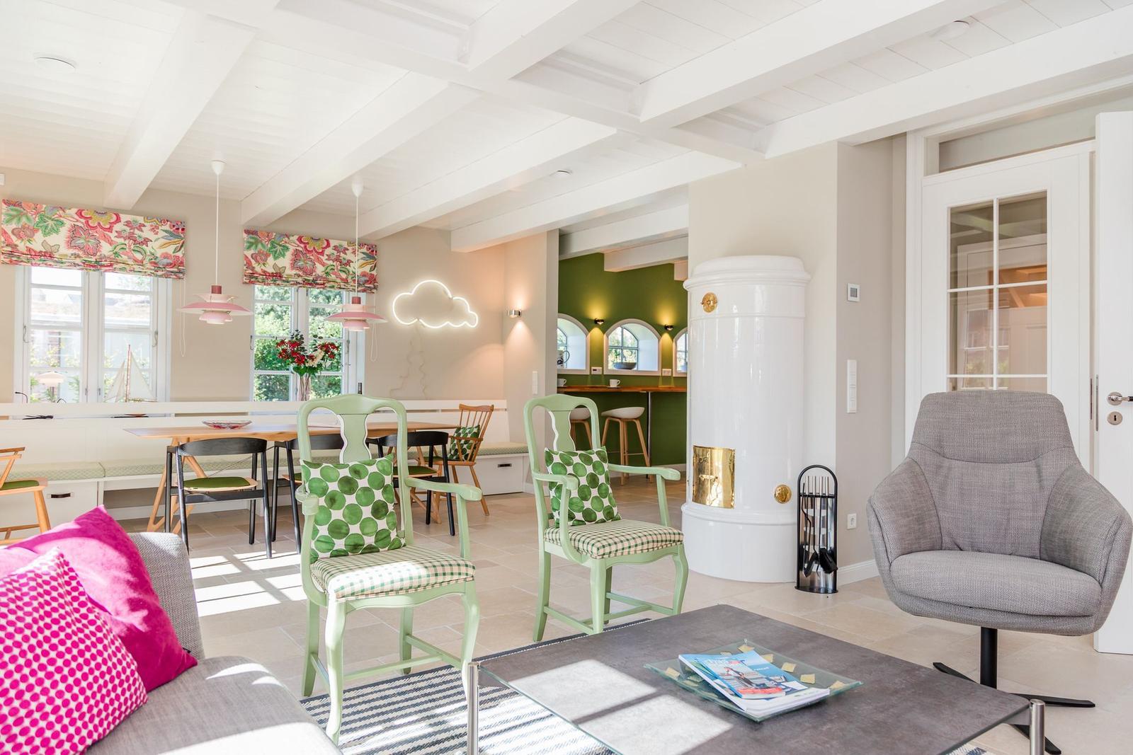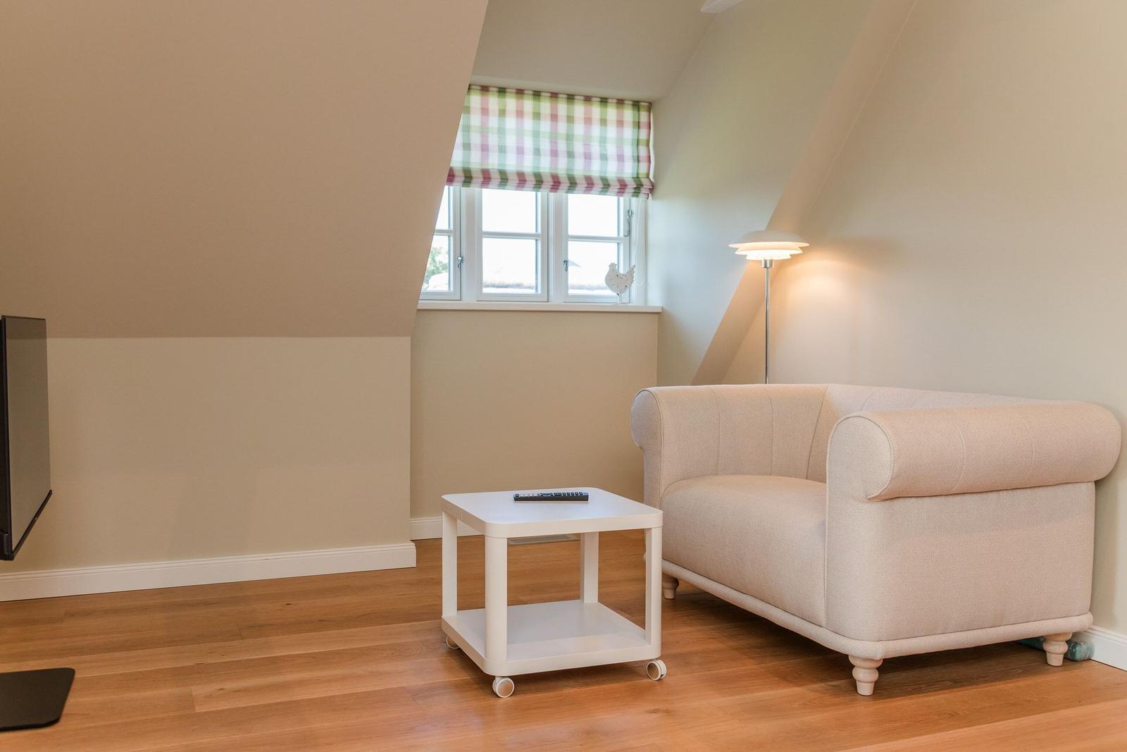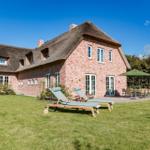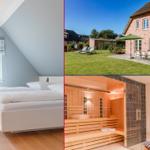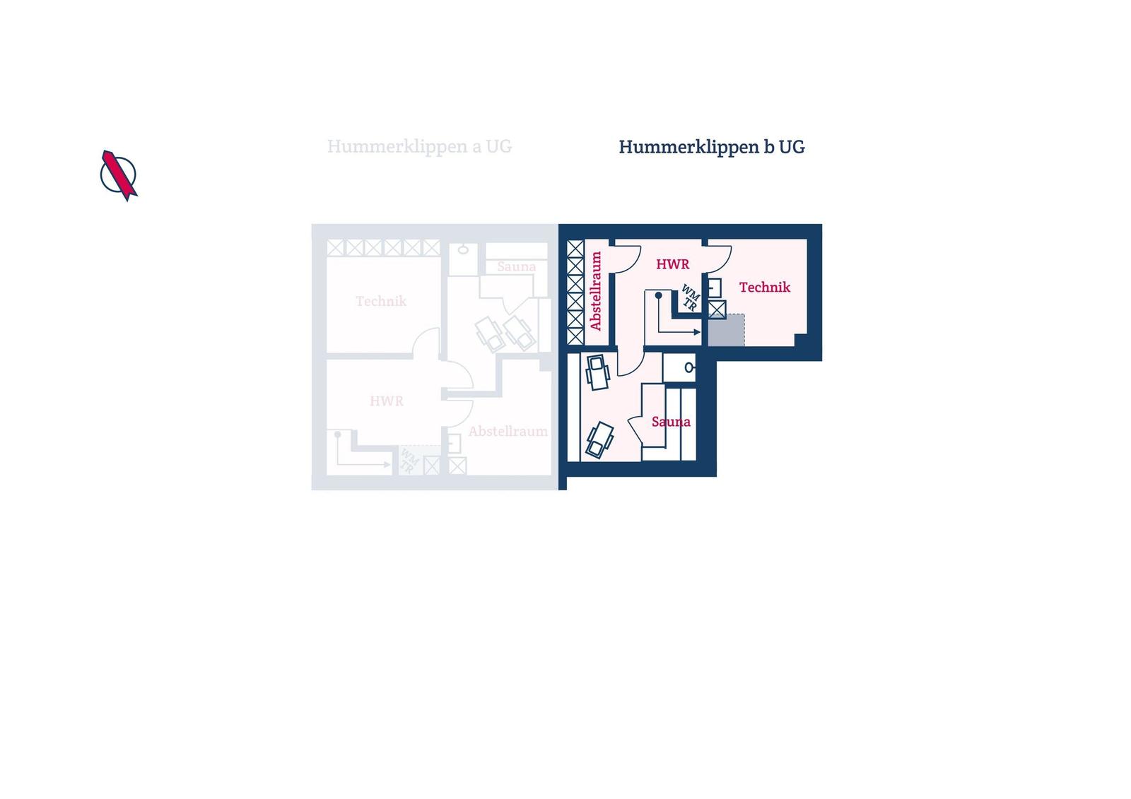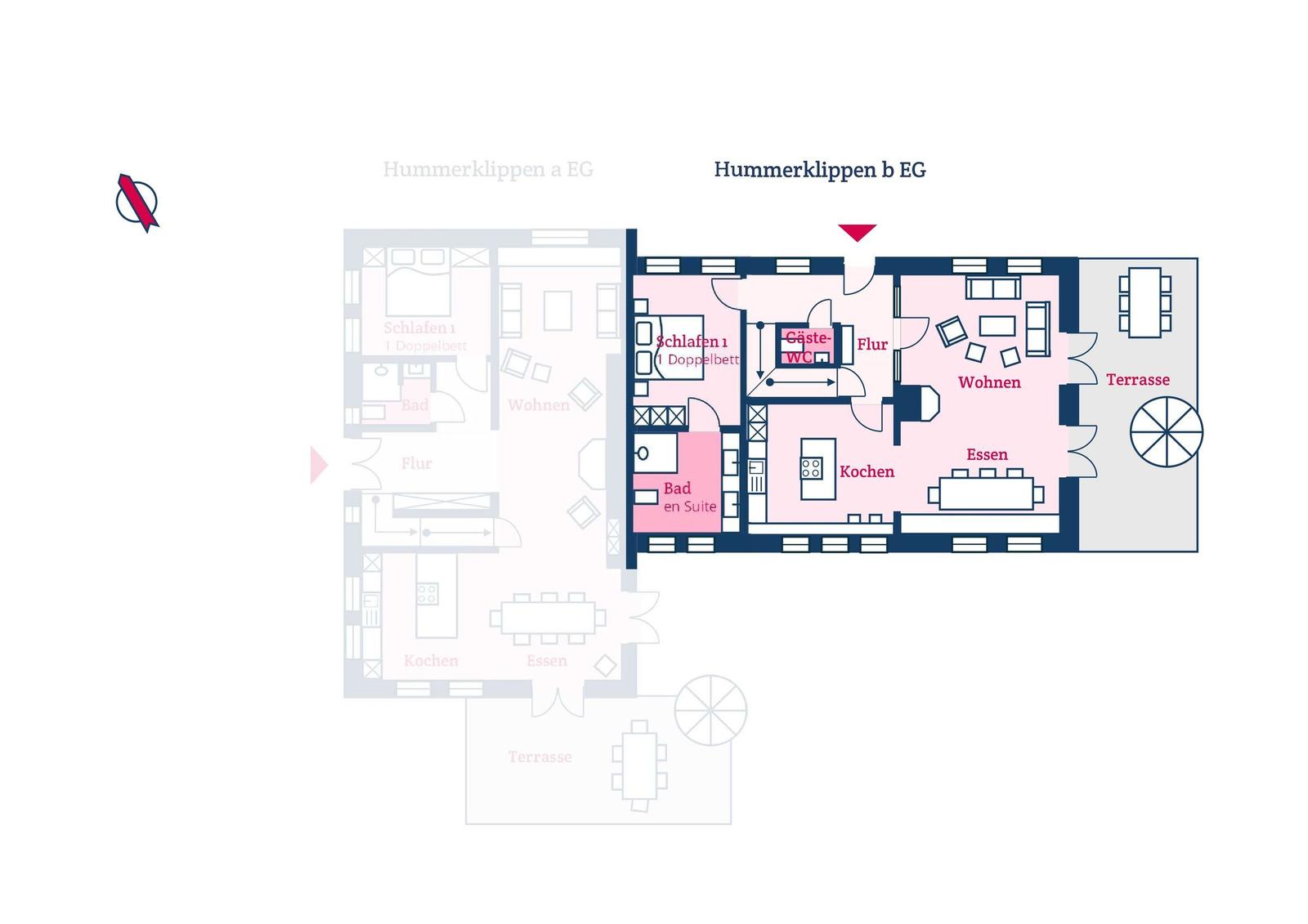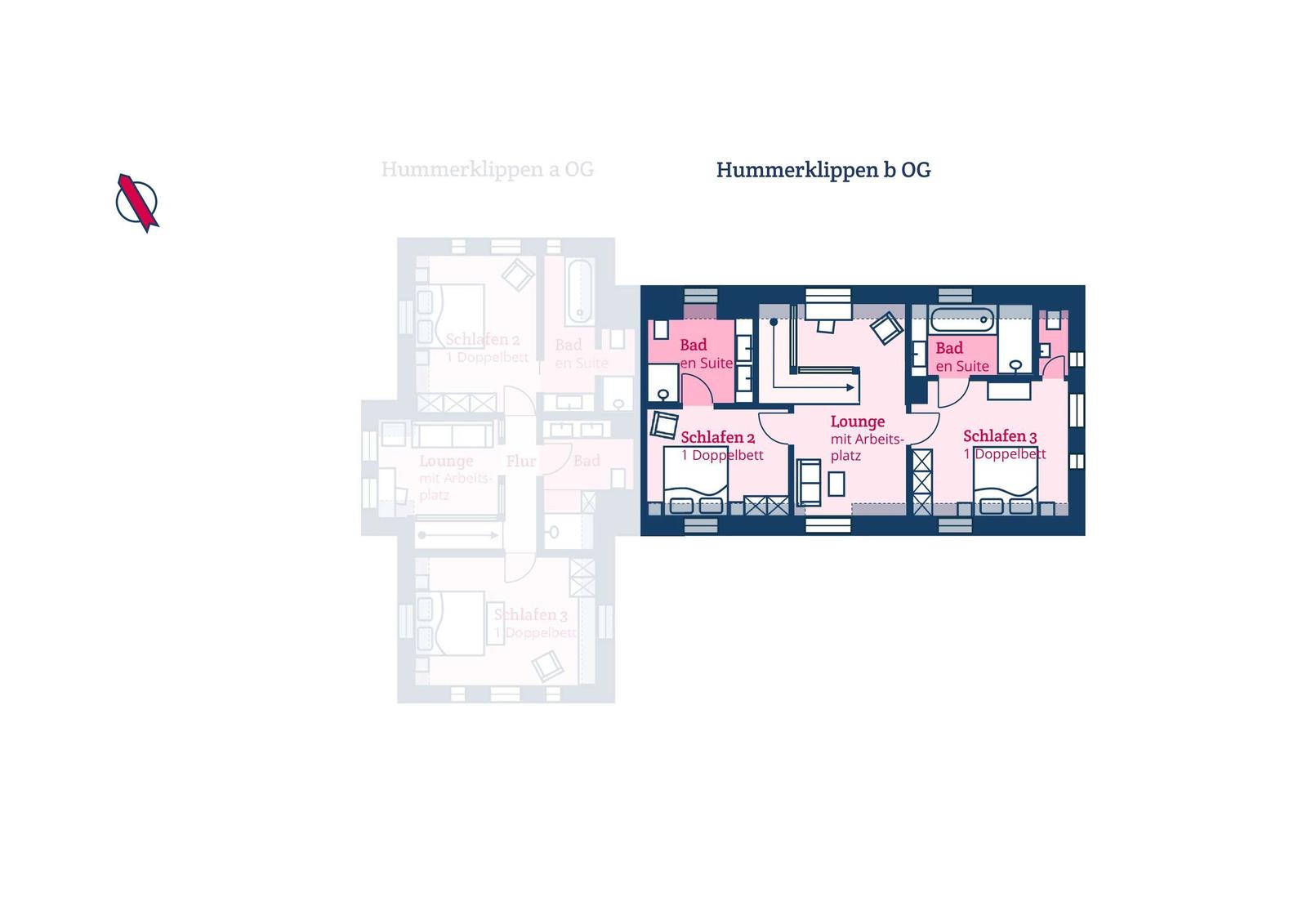 Der exklusive Ferienhausteil Hummerklippen in Süderende bietet für bis zu 6 Personen komfortable Räumlichkeiten. Im Erdgeschoss befinden sich ein großzügiger Wohn- und Essbereich mit offener Küche, ein Schlafzimmer mit Bad en Suite sowie ein Gäste-WC. Der hauseigene Original Mylin-Kachelofen schafft eine gemütliche Atmosphäre. Im Obergeschoss sind zwei weitere Schlafzimmer mit Bad en Suite und ein Loungebereich untergebracht. Das Souterrain beherbergt die hauseigene Sauna mit Ruheraum, Dusche und einen Hauswirtschaftsraum mit Waschmaschine und Trockner. Die Wohnung ist barrierefrei im Zugang, jedoch nicht behindertengerecht, da die Waschbecken im Erdgeschoss nicht unterfahrbar sind. Gemeinschaftliche Elemente wie die Sauna und der Gartenbereich stehen zur Verfügung. Bei der Ausstattung wurde Wert auf hochwertige Materialien gelegt, um den Gästen einen angenehmen Aufenthalt zu gewährleisten.