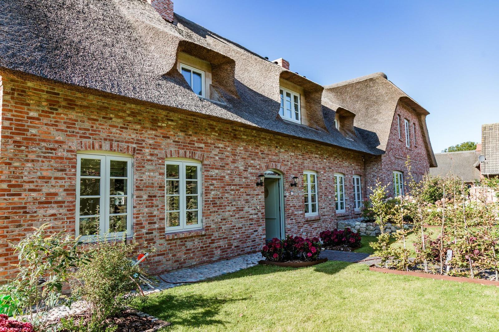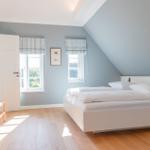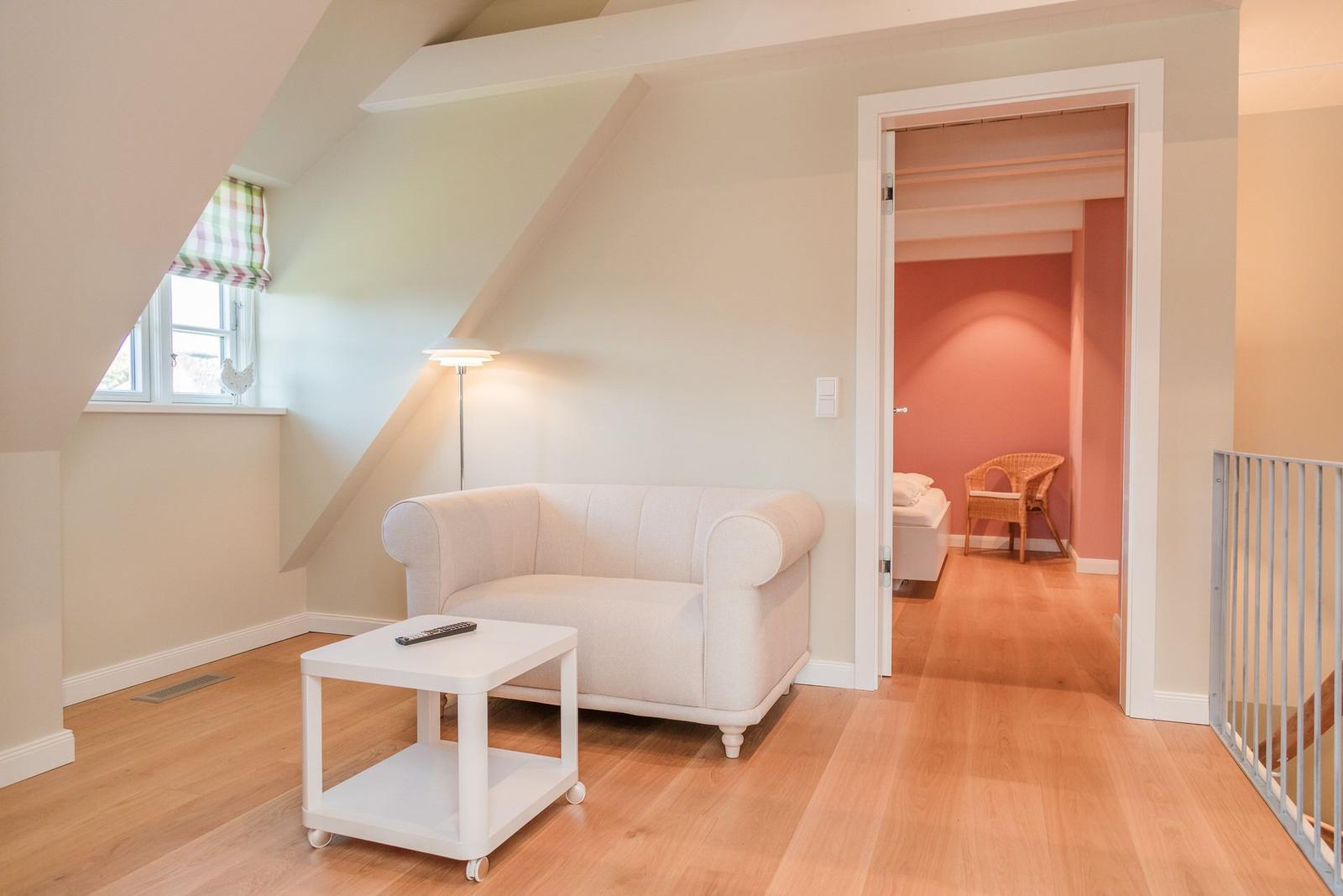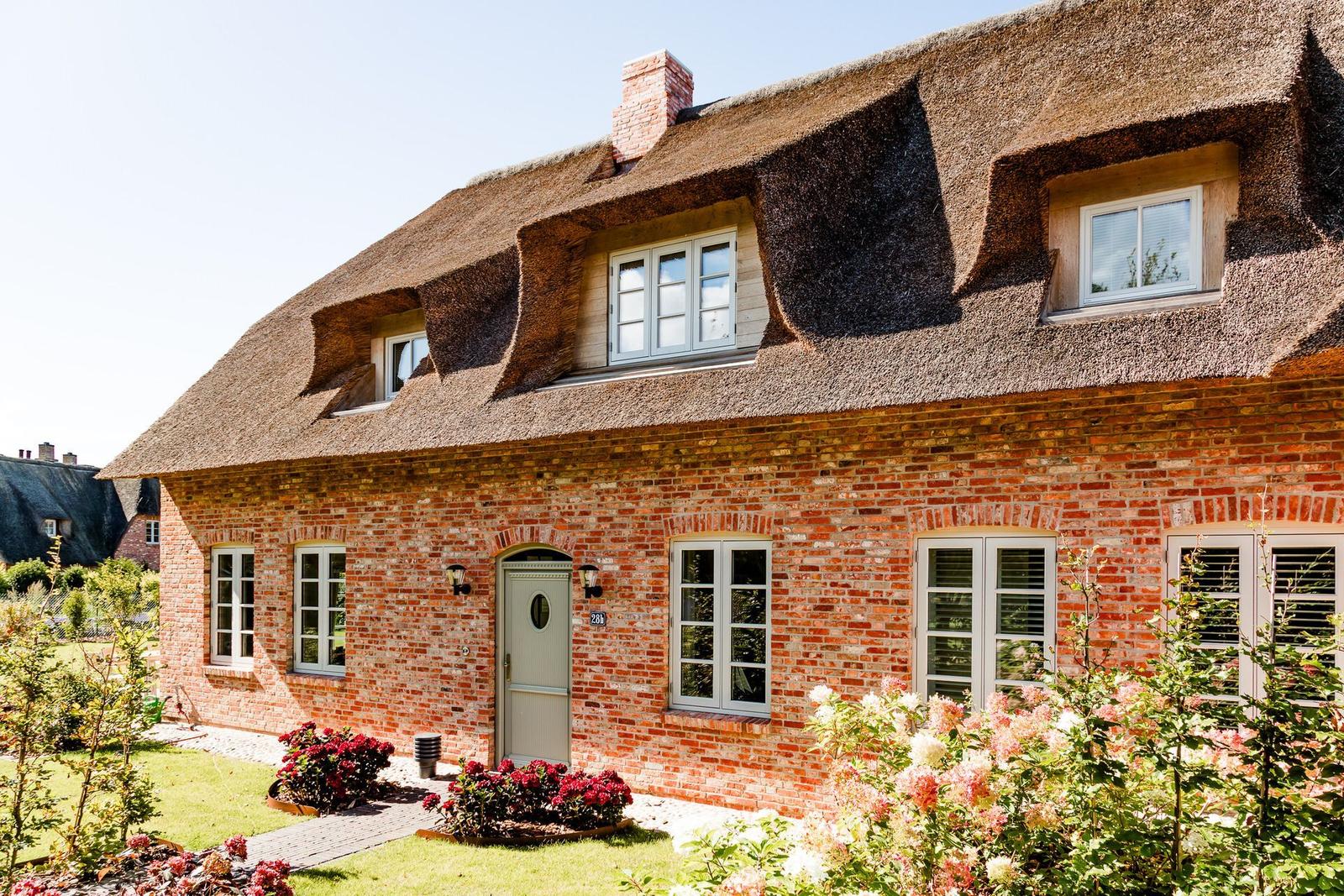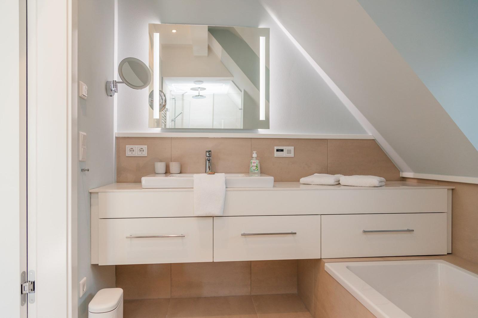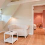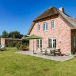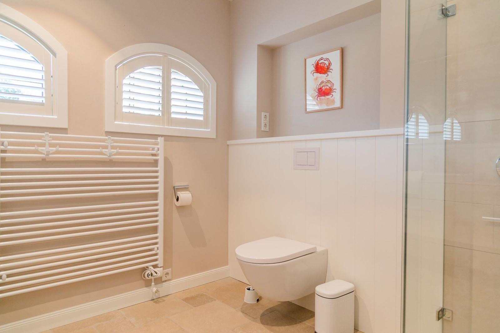 Der exklusive Ferienhausteil Hummerklippen in Süderende bietet für bis zu 6 Personen komfortable Räumlichkeiten. Im Erdgeschoss befinden sich ein großzügiger Wohn- und Essbereich mit offener Küche, ein Schlafzimmer mit Bad en Suite sowie ein Gäste-WC. Der hauseigene Original Mylin-Kachelofen schafft eine gemütliche Atmosphäre. Im Obergeschoss sind zwei weitere Schlafzimmer mit Bad en Suite und ein Loungebereich untergebracht. Das Souterrain beherbergt die hauseigene Sauna mit Ruheraum, Dusche und einen Hauswirtschaftsraum mit Waschmaschine und Trockner. Die Wohnung ist barrierefrei im Zugang, jedoch nicht behindertengerecht, da die Waschbecken im Erdgeschoss nicht unterfahrbar sind. Gemeinschaftliche Elemente wie die Sauna und der Gartenbereich stehen zur Verfügung. Bei der Ausstattung wurde Wert auf hochwertige Materialien gelegt, um den Gästen einen angenehmen Aufenthalt zu gewährleisten.