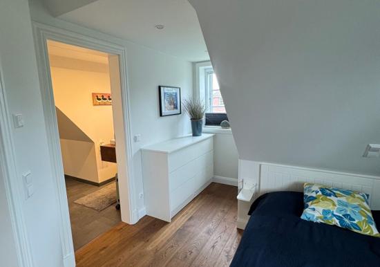 Spitzboden: Kinderschlafzimmer mit zwei Einzelbetten, schöner separater Spielbereich für Kinder.