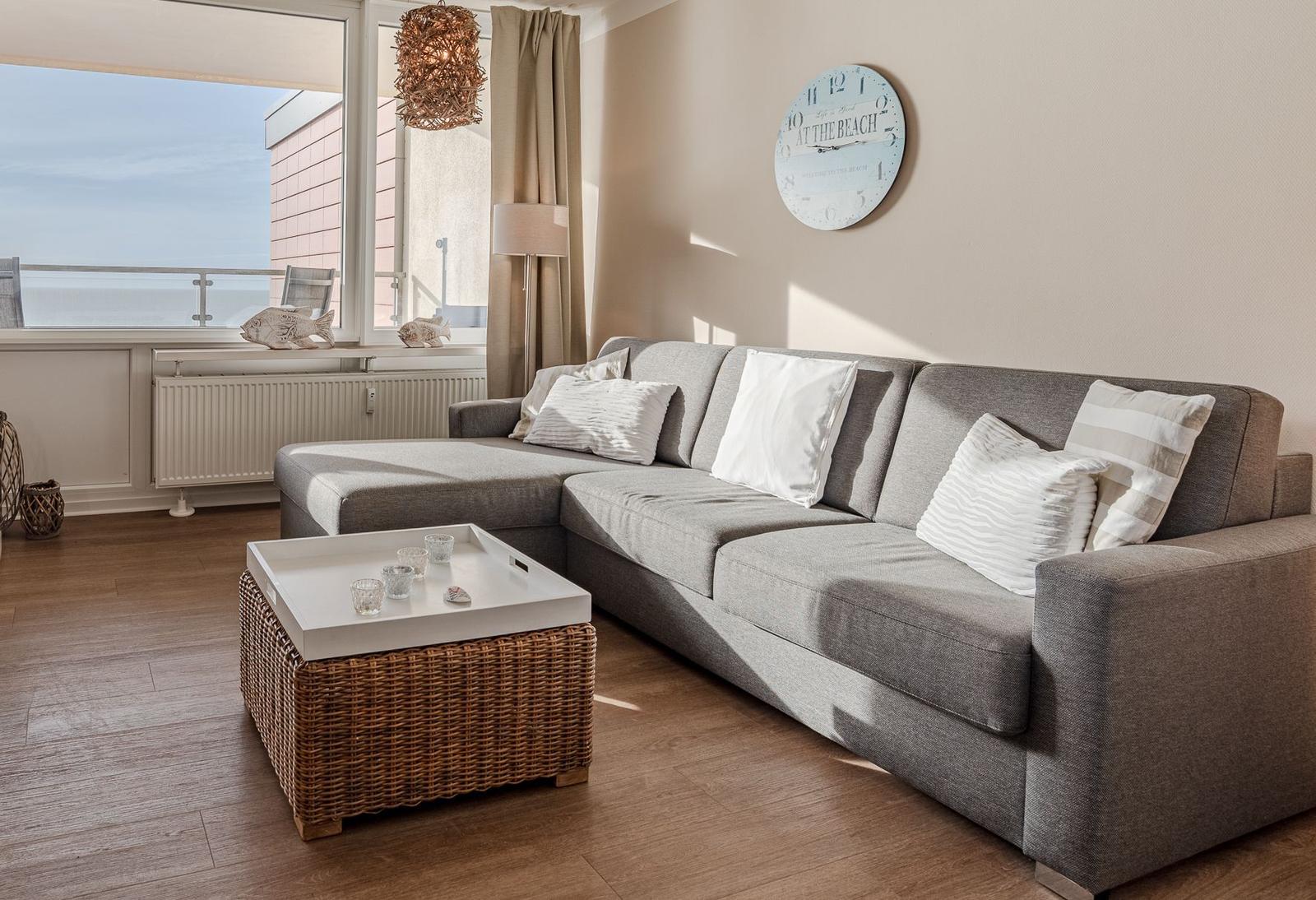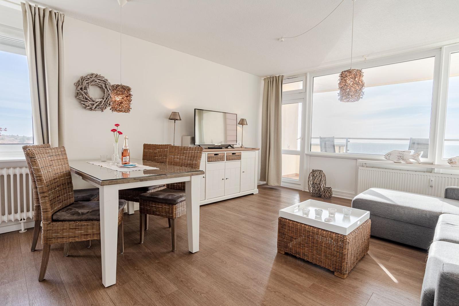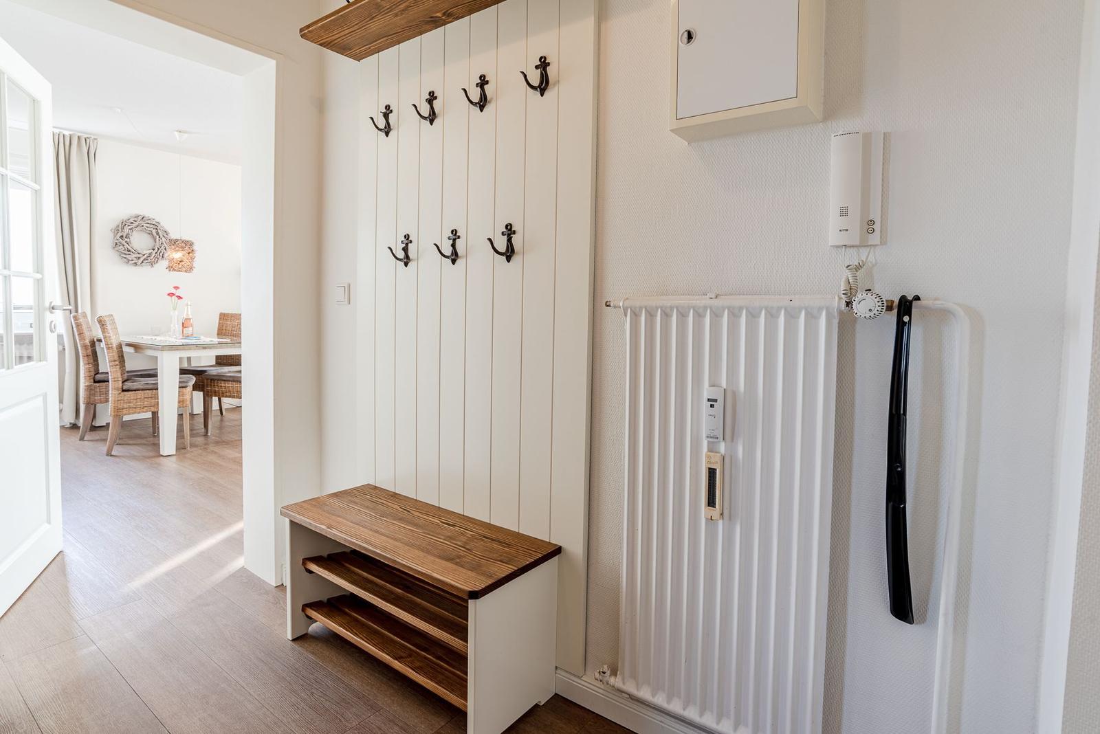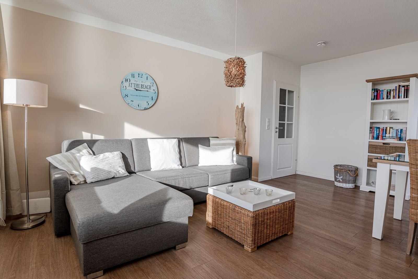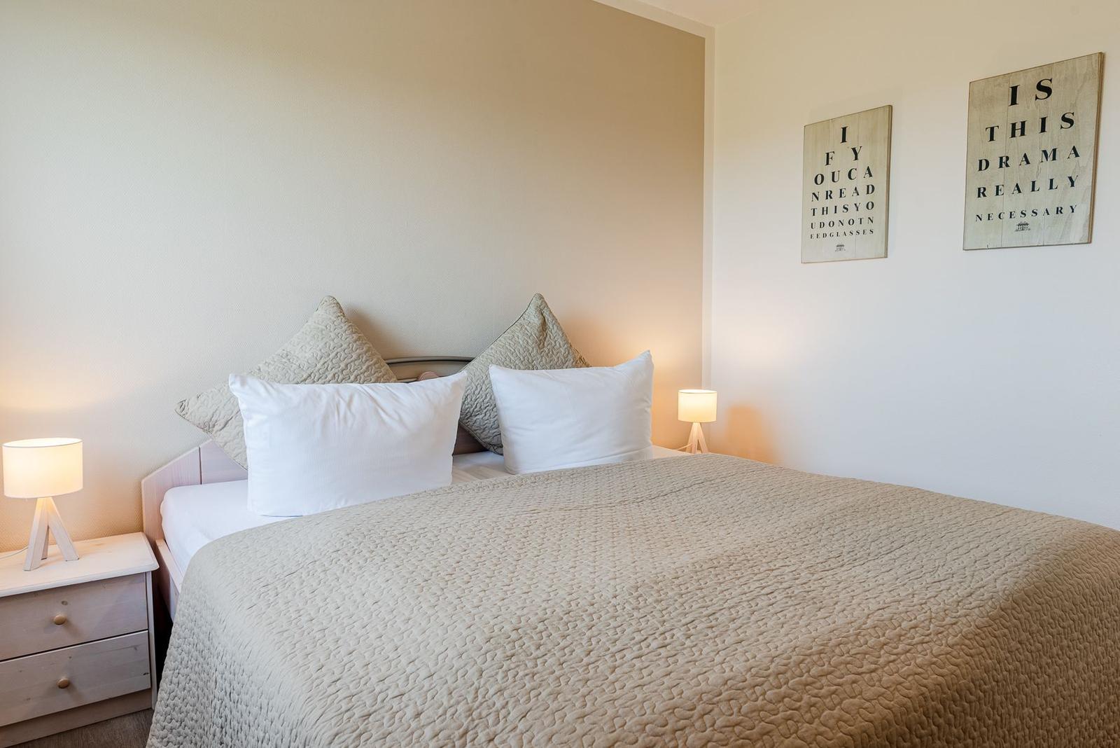 Die Ferienwohnung bietet einladende Räume und durchdachte Ausstattung für einen angenehmen Aufenthalt. Sie umfasst zwei Schlafzimmer, eines mit einem komfortablen Doppelbett und eines mit einer Schlafcouch im Wohnschlafzimmer. Ein Badezimmer mit bodengleicher Dusche und Fenster sorgt für hohen Komfort.