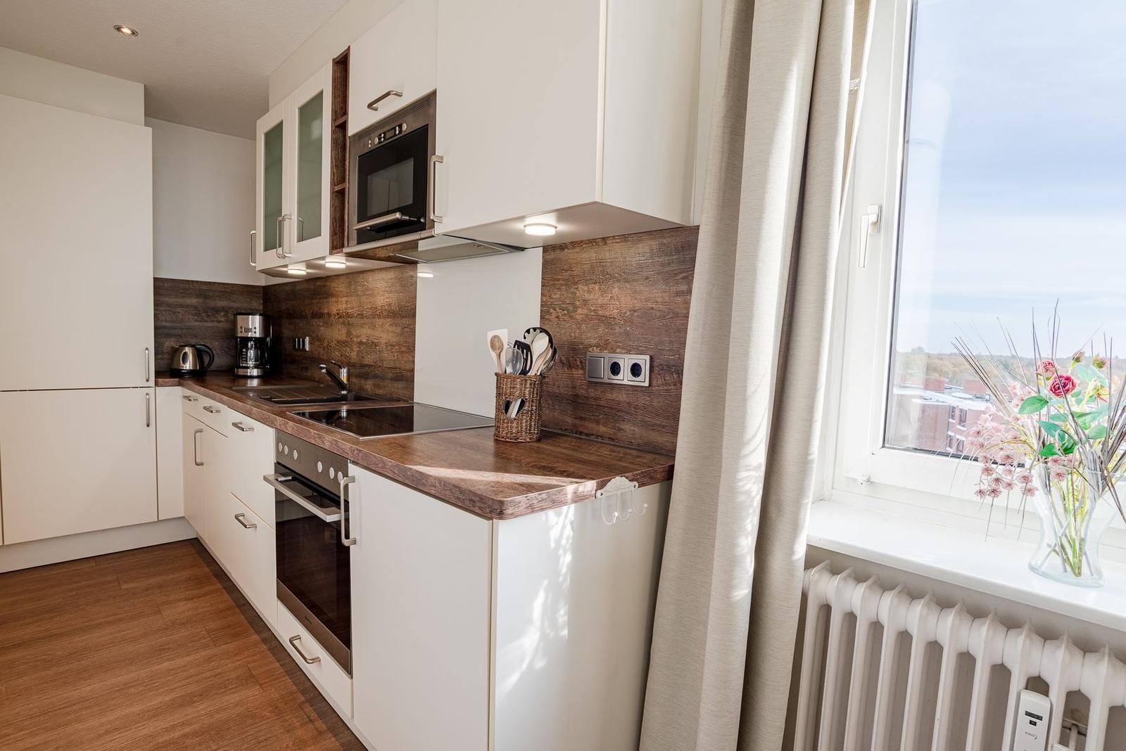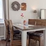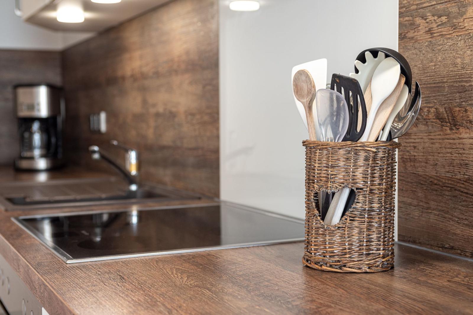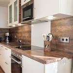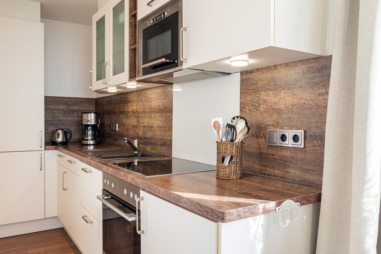 Die voll ausgestattete Küche lässt keine Wünsche offen: Ein Elektro-/Gasherd, Backofen, Mikrowelle, Kühlschrank, Geschirrspüler und Kaffeemaschine stehen bereit. Der Esstisch bietet Platz für gesellige Mahlzeiten. Das Wohnzimmer ist mit einem Sofa, Sessel und TV ausgestattet und lädt zur Entspannung ein.