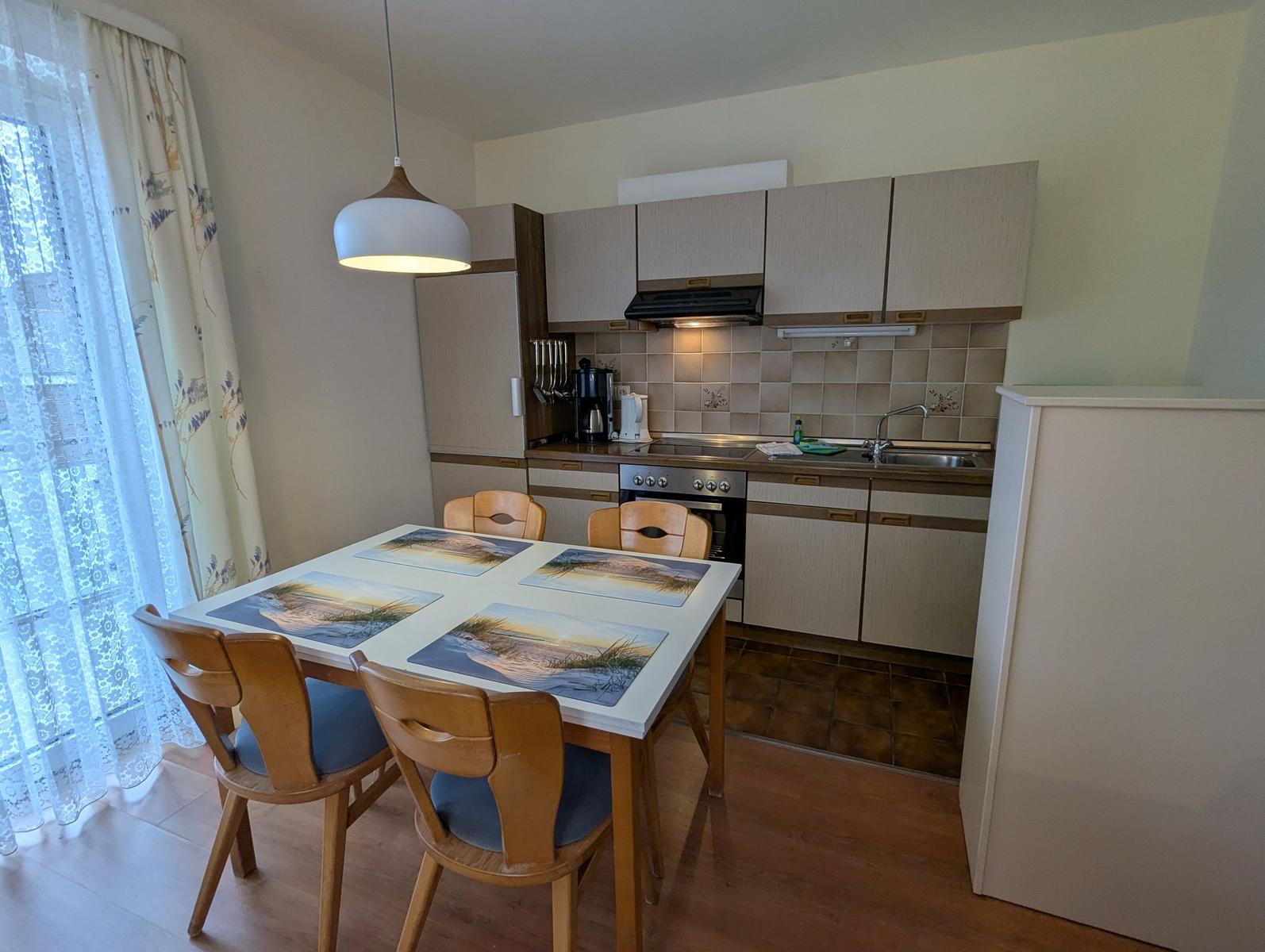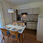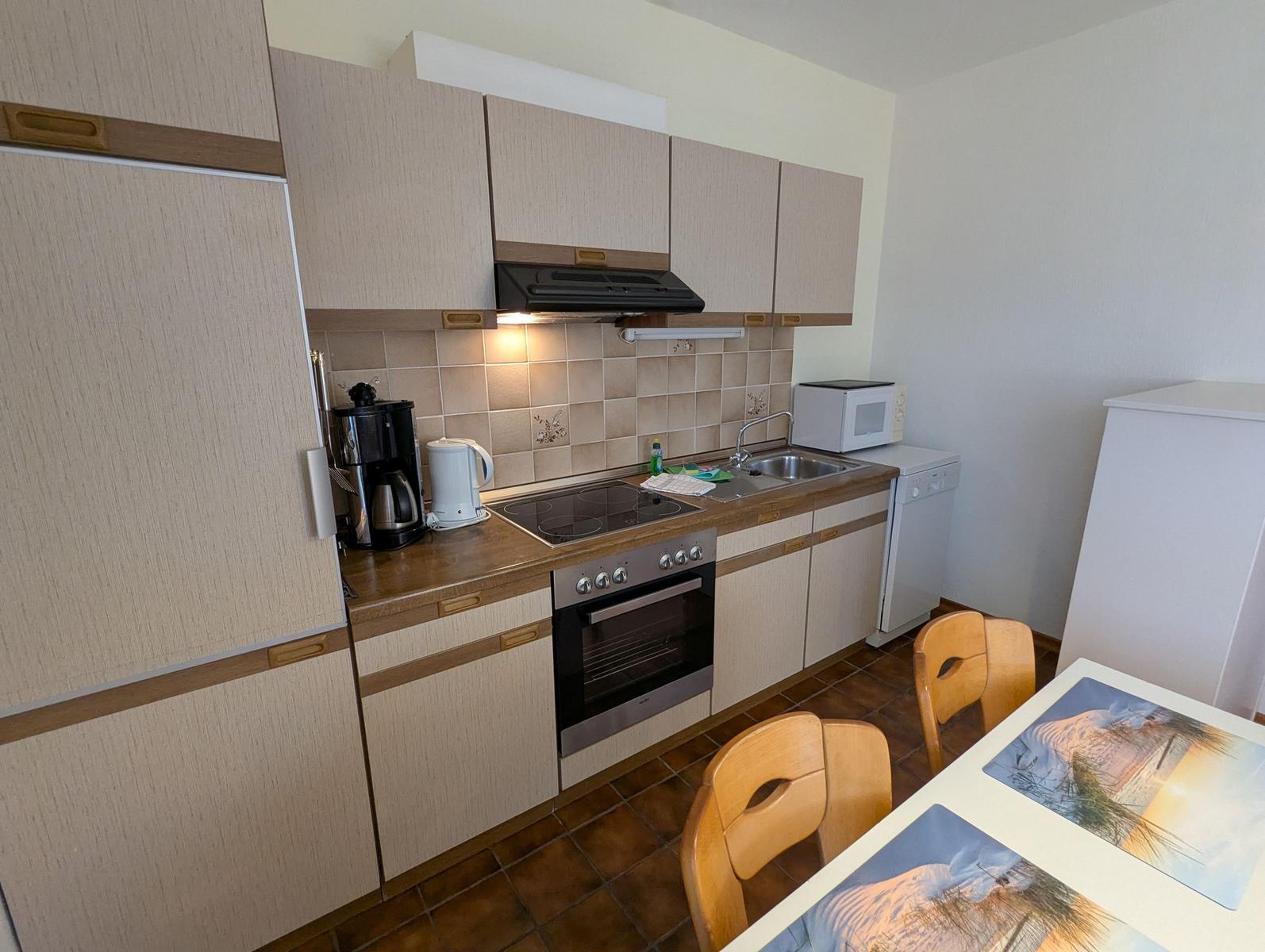 Die offene Küche ist mit allem ausgestattet, was für die Zubereitung von Mahlzeiten notwendig ist, einschließlich Geschirrspüler, Elektro- und Gasherd, Backofen, Mikrowelle, Kühlschrank und Kaffeemaschine. Gemütliche Abende sind im Wohnbereich mit Sofa, Sessel und TV möglich. WLAN-Internet ist ebenfalls verfügbar. Ein Esstisch lädt ein, gesellige Mahlzeiten zu genießen.
