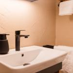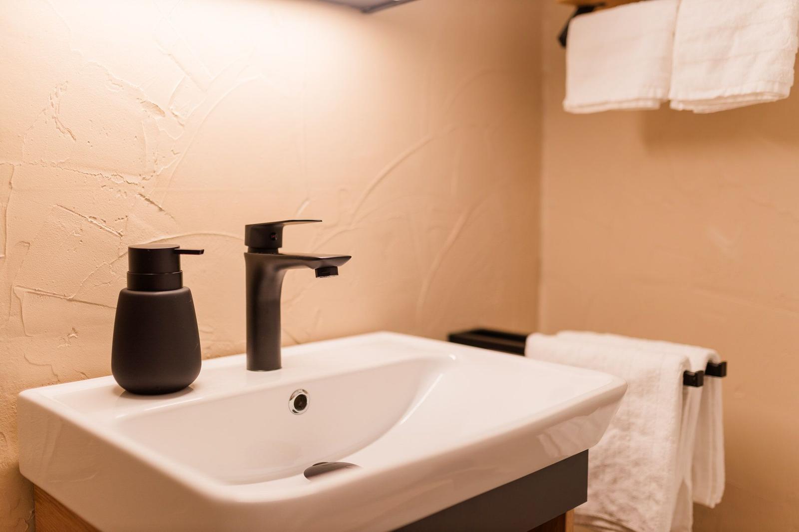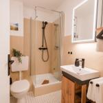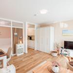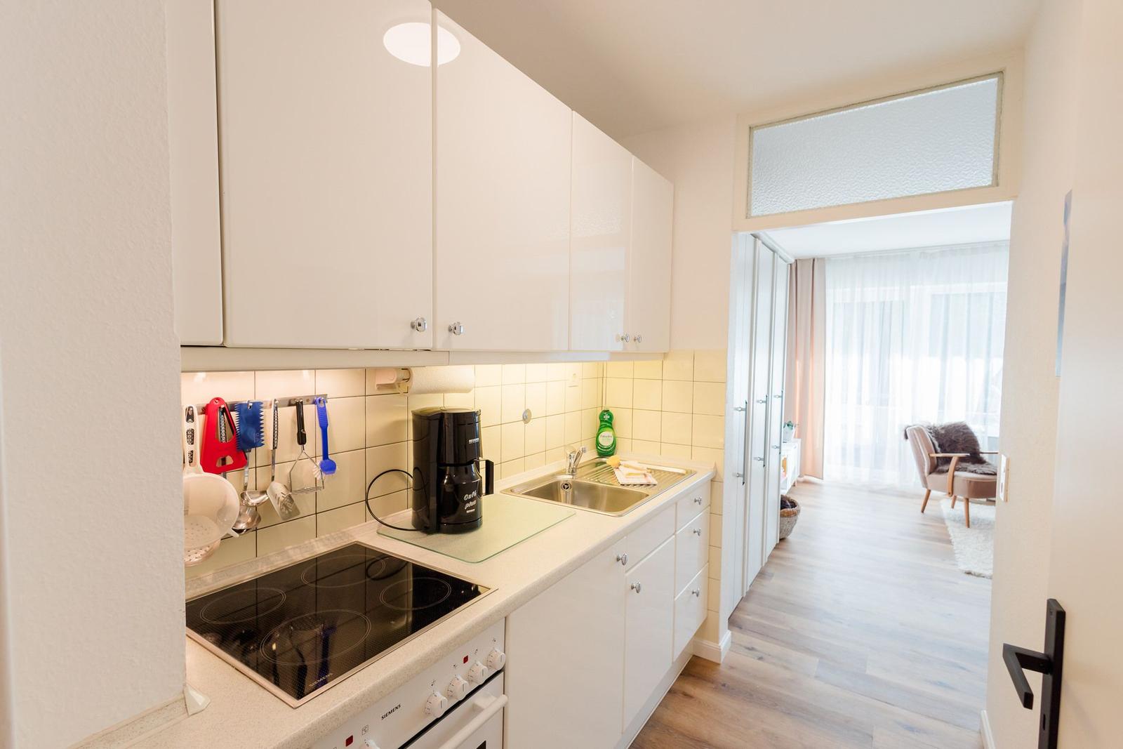 Vom Flur mit Garderobe geht es in das Duschbad und zur Küchenzeile mit Ceran Kochfeld, Backofen und Kühlschrank mit Gefrierfach. Selbstverständlich ist eine Filterkaffeemaschine, Wasserkocher und Toaster vorhanden.