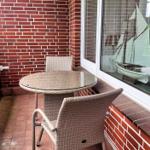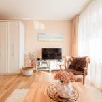 Der Wohn-/Essbereich ist durch die großen Fenster schön hell und mit Fernseher, Couch und Essplatz ausgestattet. Von dort gelangt man auf den sonnigen Südwest-Balkon mit Blick in den Garten.