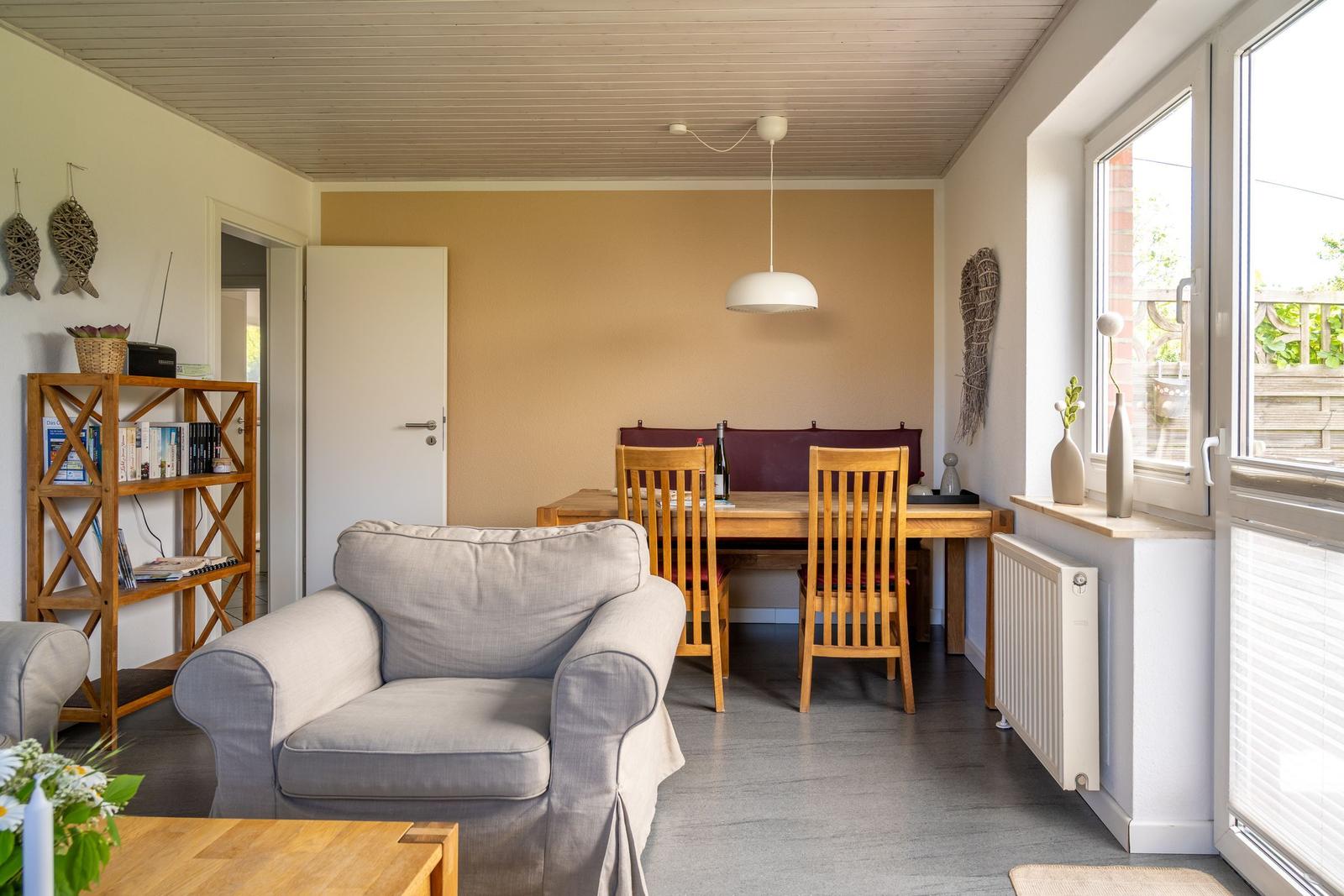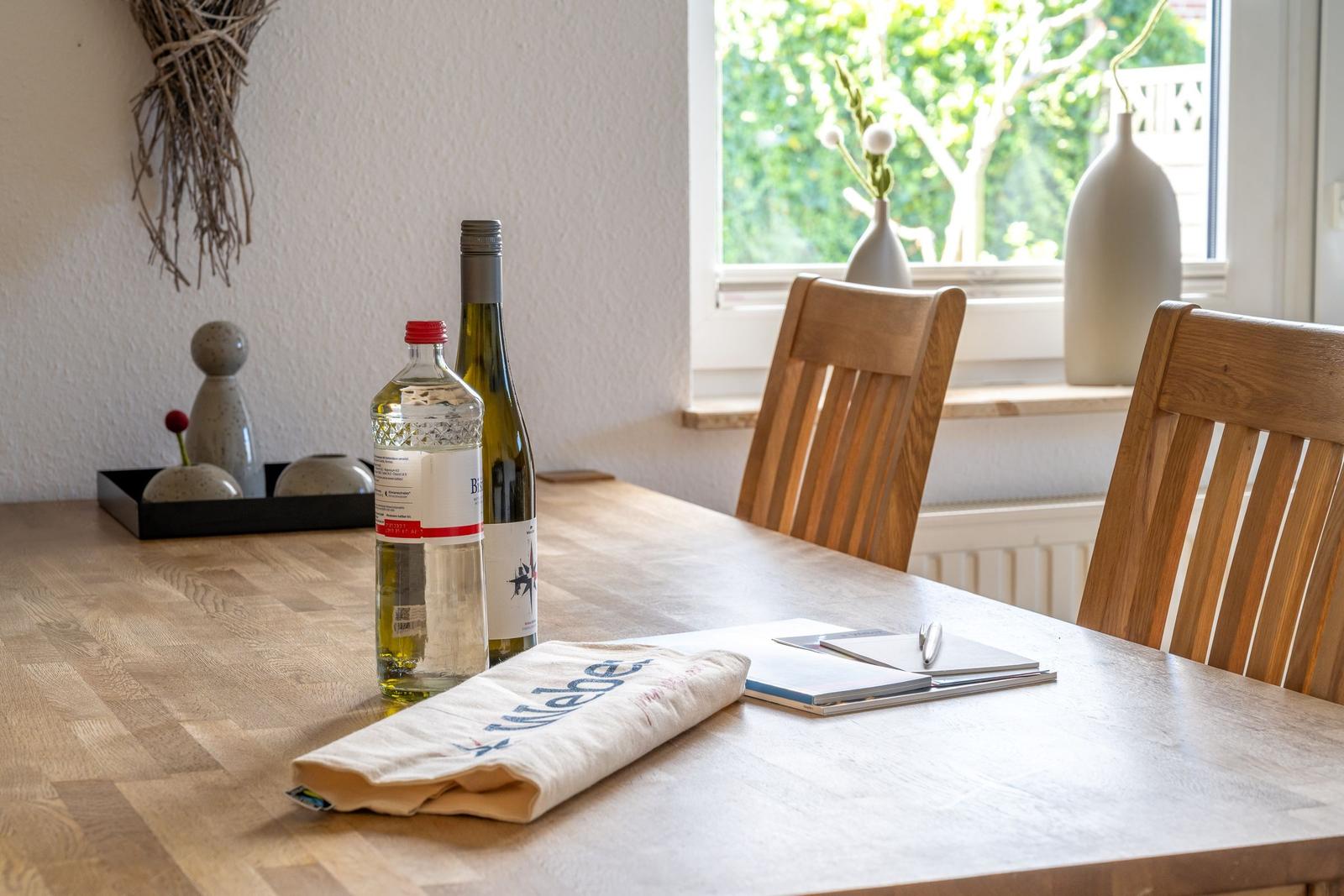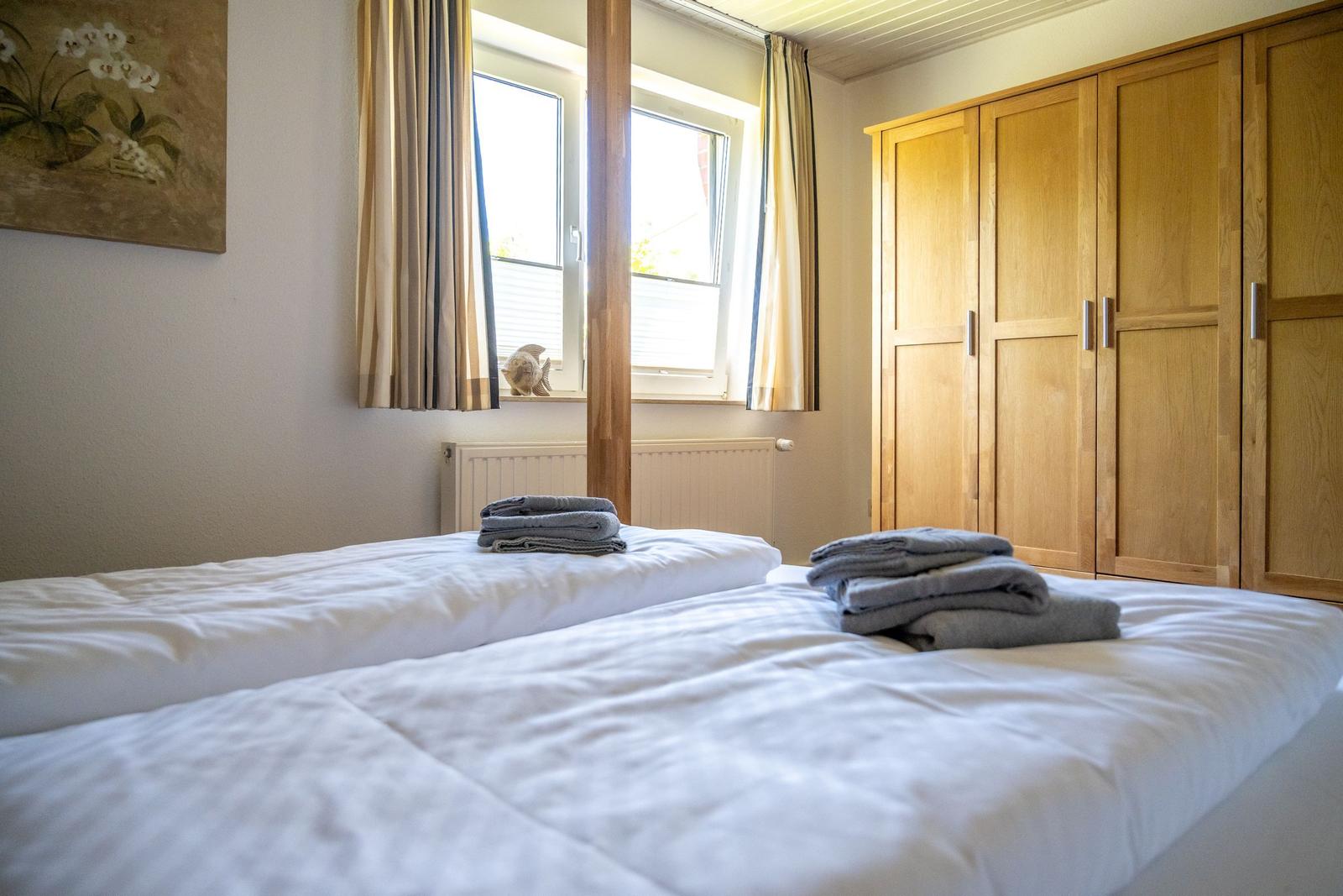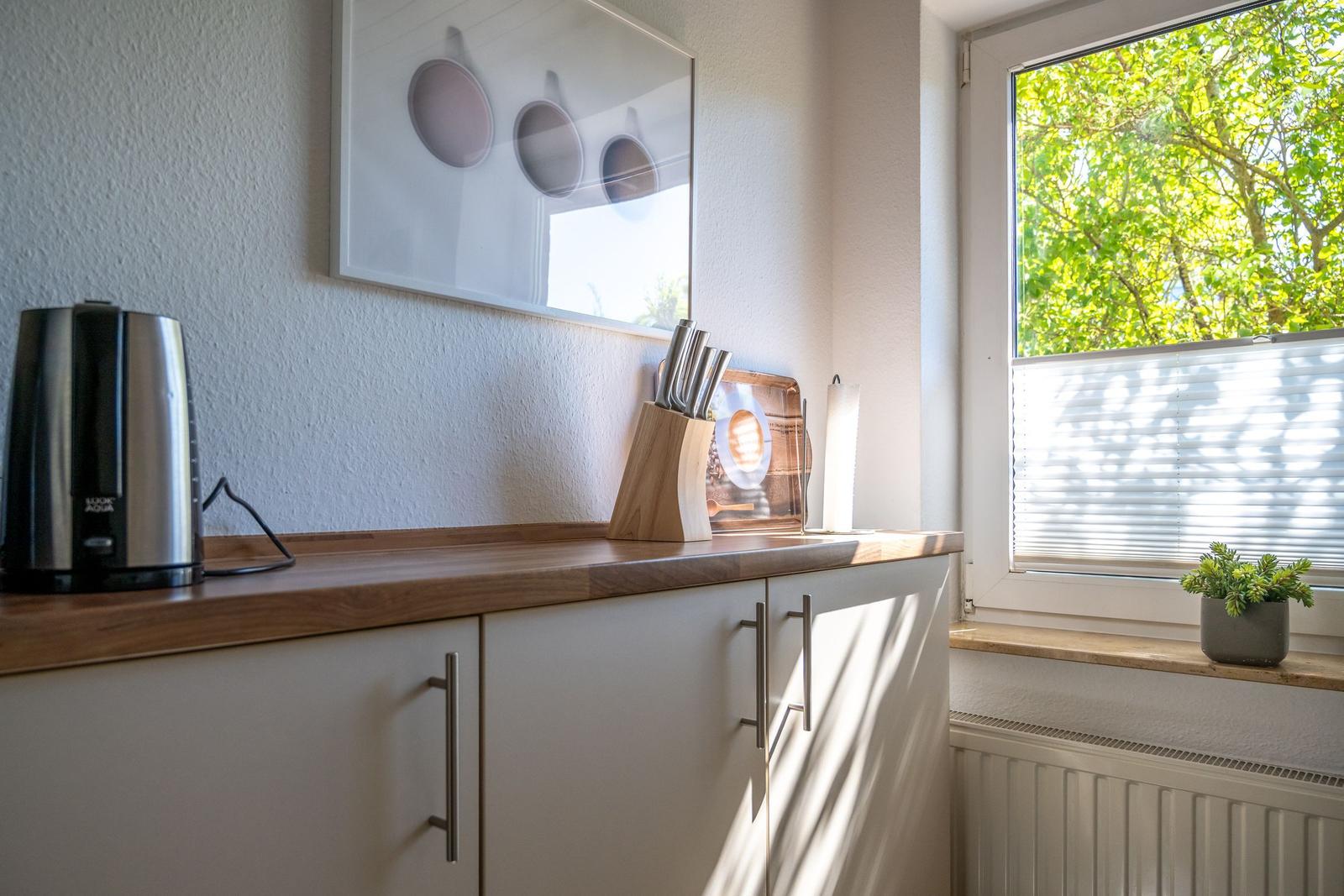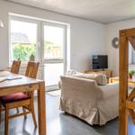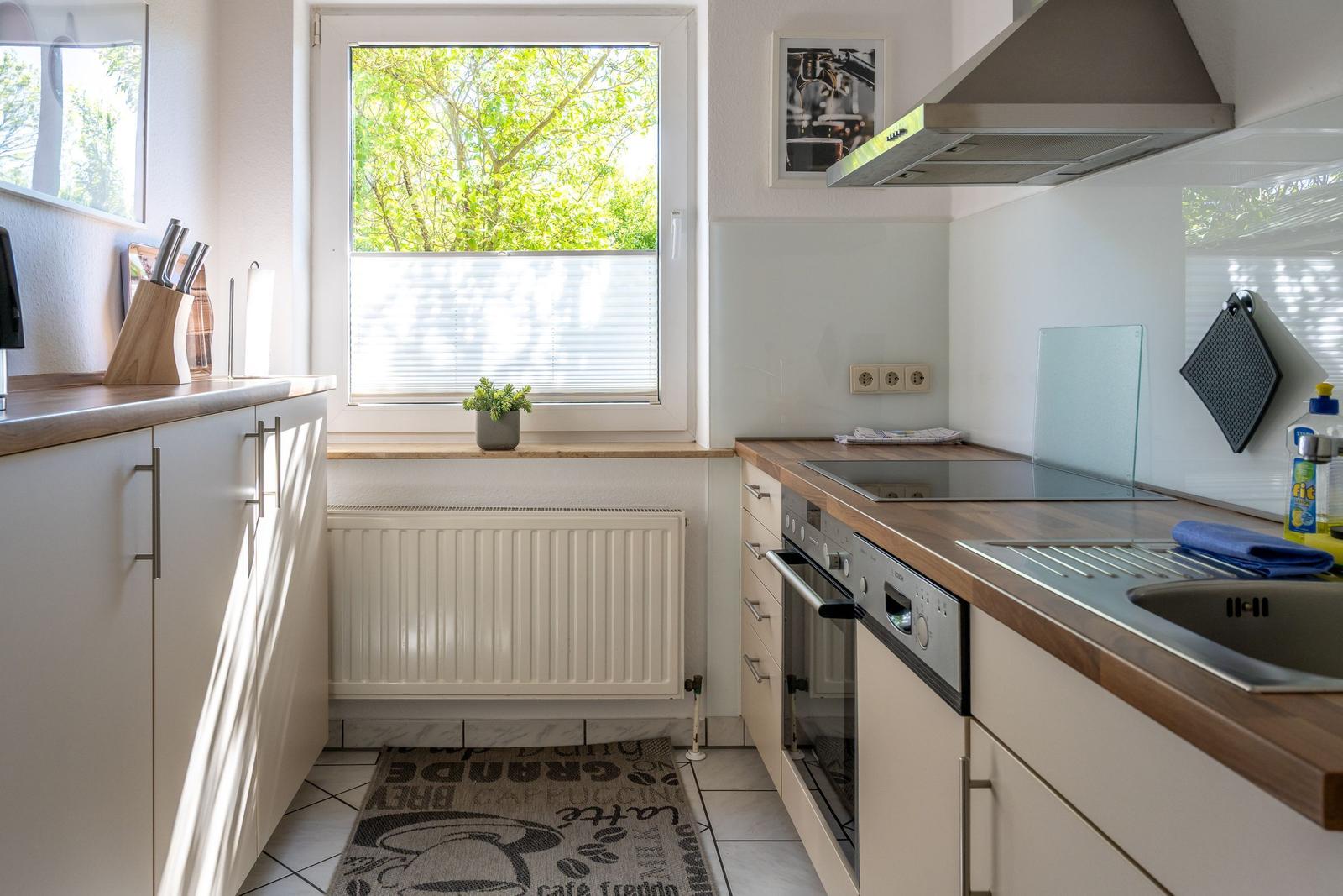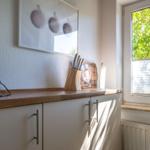 Die Ferienwohnung bietet eine komfortable und allergikergeeignete Unterkunft für bis zu vier Personen. Sie verfügt über zwei Schlafzimmer, eines mit einem Doppelbett und eines mit zwei Einzelbetten. Die separate Küche ist vollständig ausgestattet mit einem Elektro-/Gasherd, Geschirrspüler, Backofen, Kühlschrank, Gefriermöglichkeit, Kaffeemaschine, Toaster und einem Wasserkocher, was die Zubereitung von Mahlzeiten mühelos gestaltet. Zur weiteren Ausstattung gehört ein helles Duschbad mit Fenster, das mit einem Haartrockner und einem Starterset an Pflegeprodukten ausgestattet ist. Im Wohnbereich können Gäste auf einem Sofa entspannen und sich mit der HiFi-Anlage oder dem TV unterhalten. Praktische Extras wie WLAN, Waschmaschine, Wäschetrockner, Bügeleisen und Parkplatz runden das Angebot ab. Auch für die Kleinsten ist gesorgt, ein Kinderhochstuhl steht bereit. Die Wohnung ist durch Fliegengitter und Rauchmelder sicher und komfortabel.