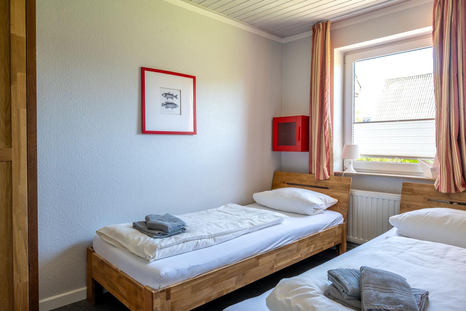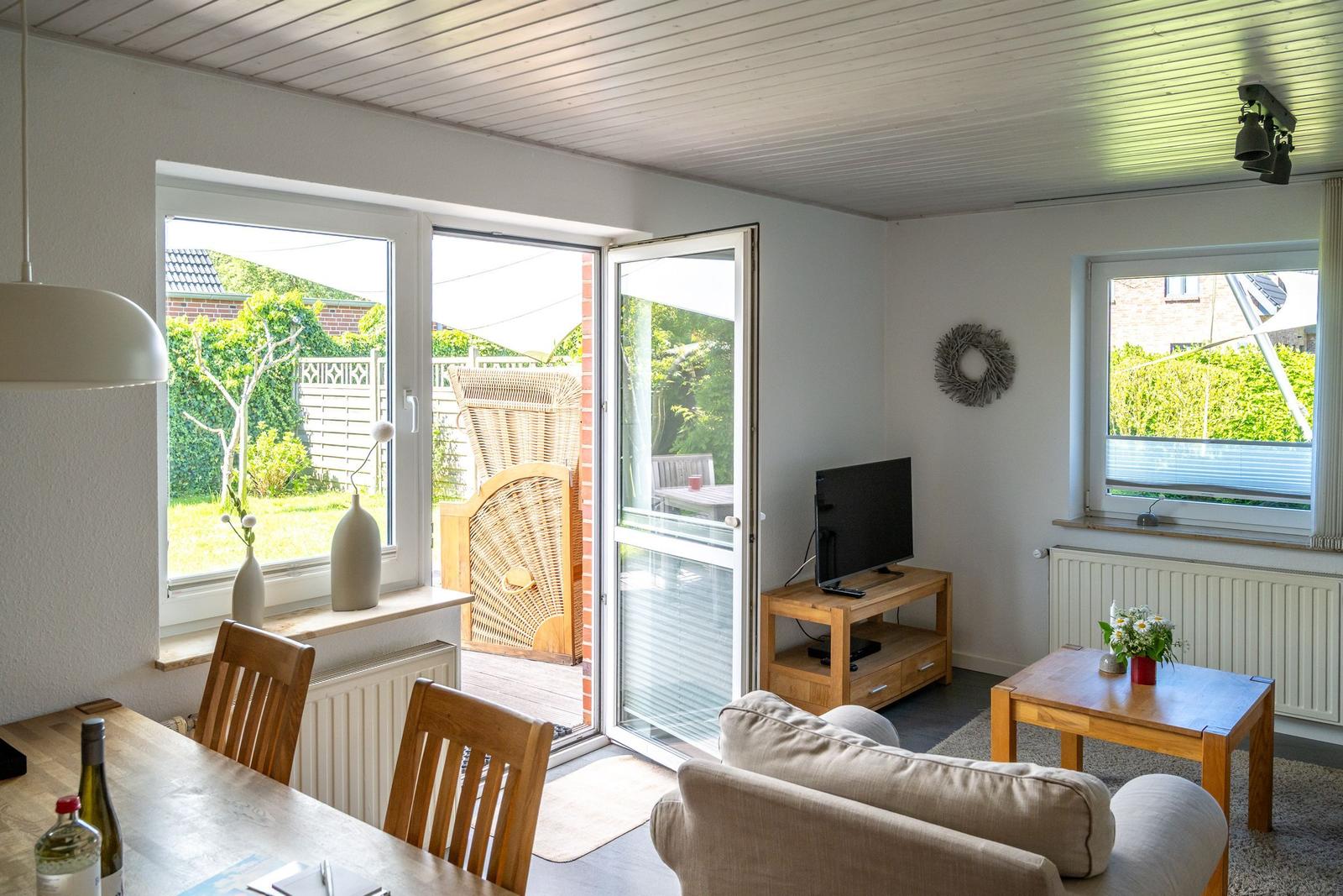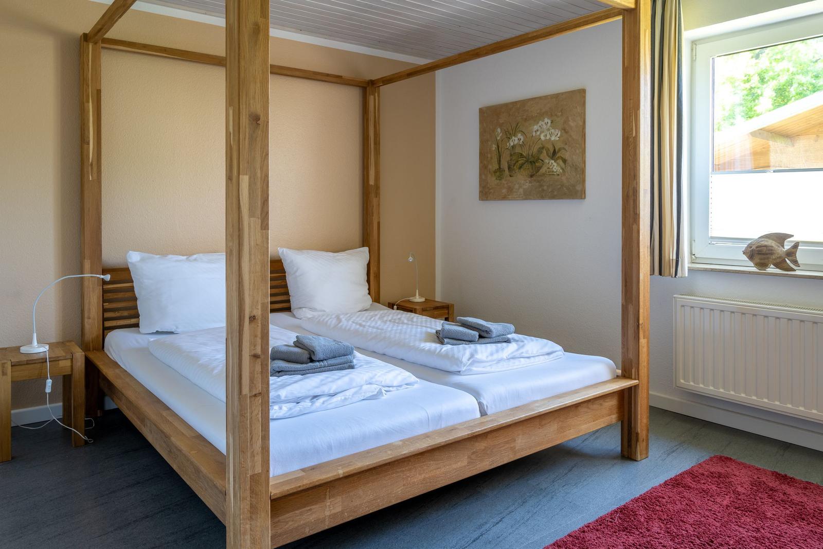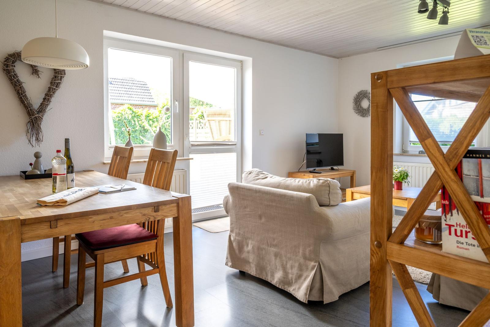 Die Ferienwohnung bietet eine komfortable und allergikergeeignete Unterkunft für bis zu vier Personen. Sie verfügt über zwei Schlafzimmer, eines mit einem Doppelbett und eines mit zwei Einzelbetten. Die separate Küche ist vollständig ausgestattet mit einem Elektro-/Gasherd, Geschirrspüler, Backofen, Kühlschrank, Gefriermöglichkeit, Kaffeemaschine, Toaster und einem Wasserkocher, was die Zubereitung von Mahlzeiten mühelos gestaltet. Zur weiteren Ausstattung gehört ein helles Duschbad mit Fenster, das mit einem Haartrockner und einem Starterset an Pflegeprodukten ausgestattet ist. Im Wohnbereich können Gäste auf einem Sofa entspannen und sich mit der HiFi-Anlage oder dem TV unterhalten. Praktische Extras wie WLAN, Waschmaschine, Wäschetrockner, Bügeleisen und Parkplatz runden das Angebot ab. Auch für die Kleinsten ist gesorgt, ein Kinderhochstuhl steht bereit. Die Wohnung ist durch Fliegengitter und Rauchmelder sicher und komfortabel.