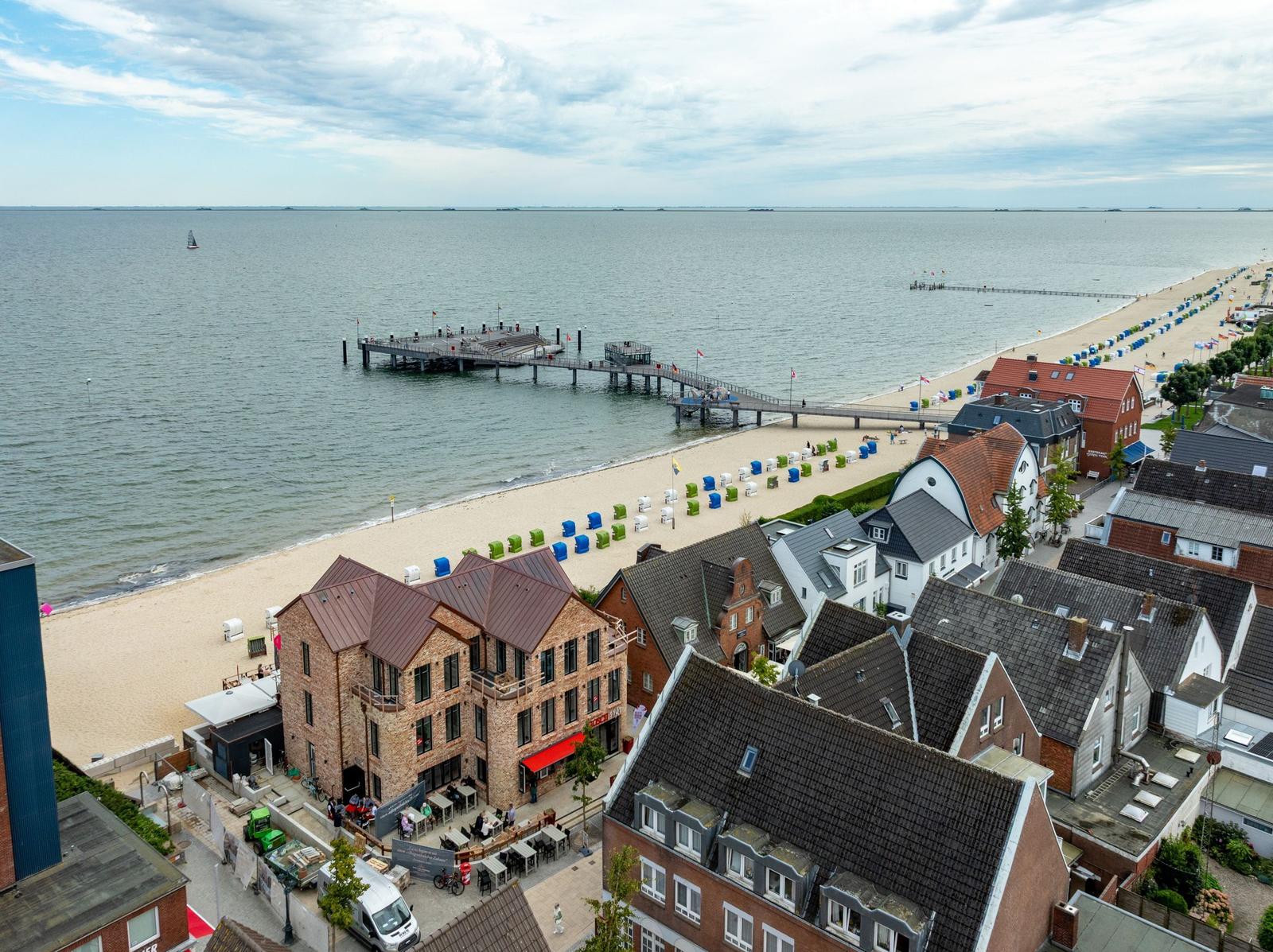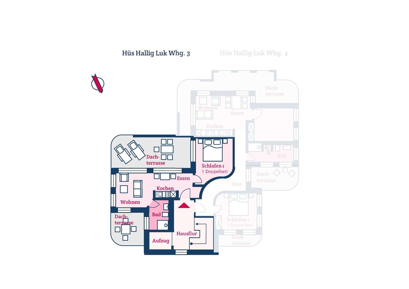 Die Wohnung ist vollständig im Penthouse-Geschoss gelegen und bequem über einen Aufzug erreichbar. Zwei Dachterrassen, eine nach Osten und eine nach Südosten ausgerichtet, bieten beeindruckende Ausblicke auf die Halligen und das Festland. Gemeinschaftlich nutzbare Einrichtungen finden sich in direkter Umgebung.